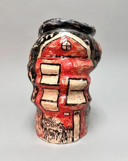 This hand-build ceramic vessel tells a narrative using illustrations, movement in form, and colorful glaze. The shape informs the narrative, bulbous portraits and a wiggly house use space and form to suggest prominent figures and a hazy house.